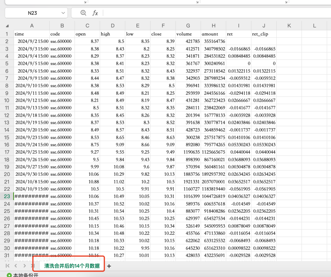 清洗阶段围绕“字段统一、类型正确、异常剔除、稳健化处理、交易日对齐”展开。首先应统一各月 CSV 的字段命名与数据类型,将常见中文列名(如“日期/交易日期、代码/证券代码、开盘/最高/最低/收盘、成交量/成交额”)映射为统一的小写英文字段time, code, open, high, low, close, volume, amount,其中time 强制解析为日期或日期时间,code 统一为字符串并保留后缀(如.SH/.SZ),数值列统一为浮点。