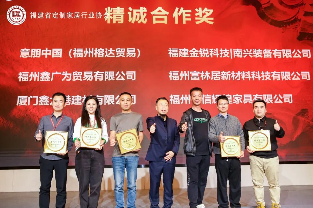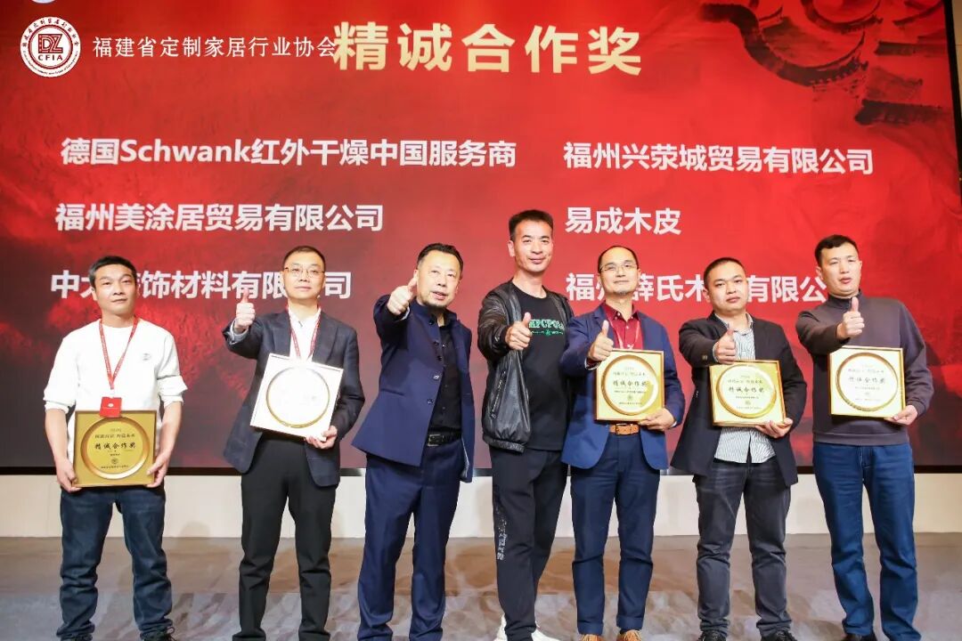 德国Schwank、福州美涂居贸易有限公司、中大装饰材料有限公司、福州兴荥城贸易有限公司、易成木皮、福州薛氏木业有限公司、意朋中国(福州榕达贸易)、福州鑫广为贸易有限公司、厦门鑫九港建材有限公司、福建金锐科技|南兴装备有限公司福州富林居新材料科技有限公司、福州佳信辉煌家具有限公司颁发“精诚合作”荣誉。