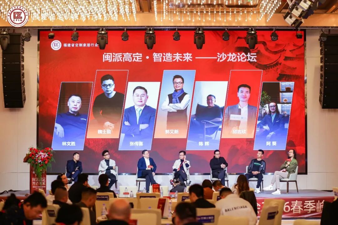 沙龙论坛环节,世界绿色设计组织绿色生活方式委员会主席、中国高定俱乐部和高定设计周创始人 张传喜先生福建省室内装饰装修协会会长 郭又新先生HDA创始人兼企划总监、WEI建筑与室内设计总监、WCDA全案设计联盟发起人 魏士能先生十上设计创始人/设计总监 陈辉先生福建省定制家居行业协会会长 邱吉欣先生福建省定制家居行业协会福州分会会长 林文胜先生如然文化创始人、@阿葵和他的朋友们主理人 阿葵先生围绕闽派高定的现状定位、产业特色、消费趋势及未来方向展开热烈讨论,为与会者带来了一场思想盛宴。