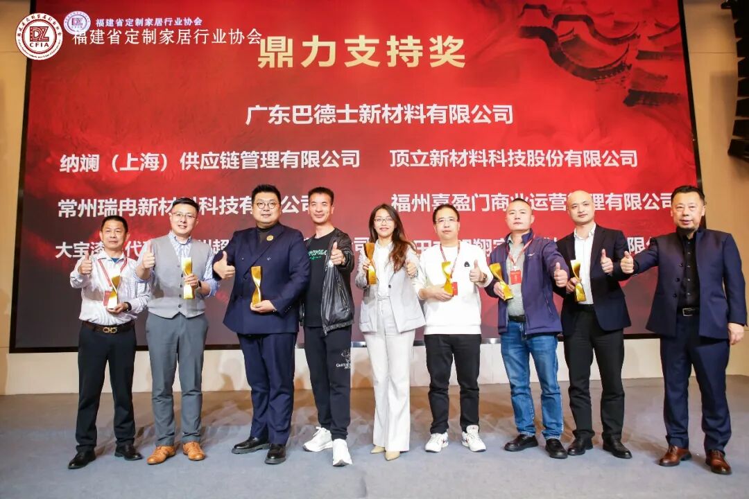 福建省定制家居行业协会会长 邱吉欣先生、福建省定制家居行业协会福州分会会长 林文胜先生广东巴德士新材料有限公司、纳斓(上海)供应链管理有限公司、常州瑞冉新材料科技有限公司、顶立新材料科技股份有限公司、福州喜盈门商业运营管理有限公司、莆田市明翔家具辅材工贸有限公司、大宝漆总代理福州超嘉镒贸易有限公司颁发“鼎力支持”荣誉