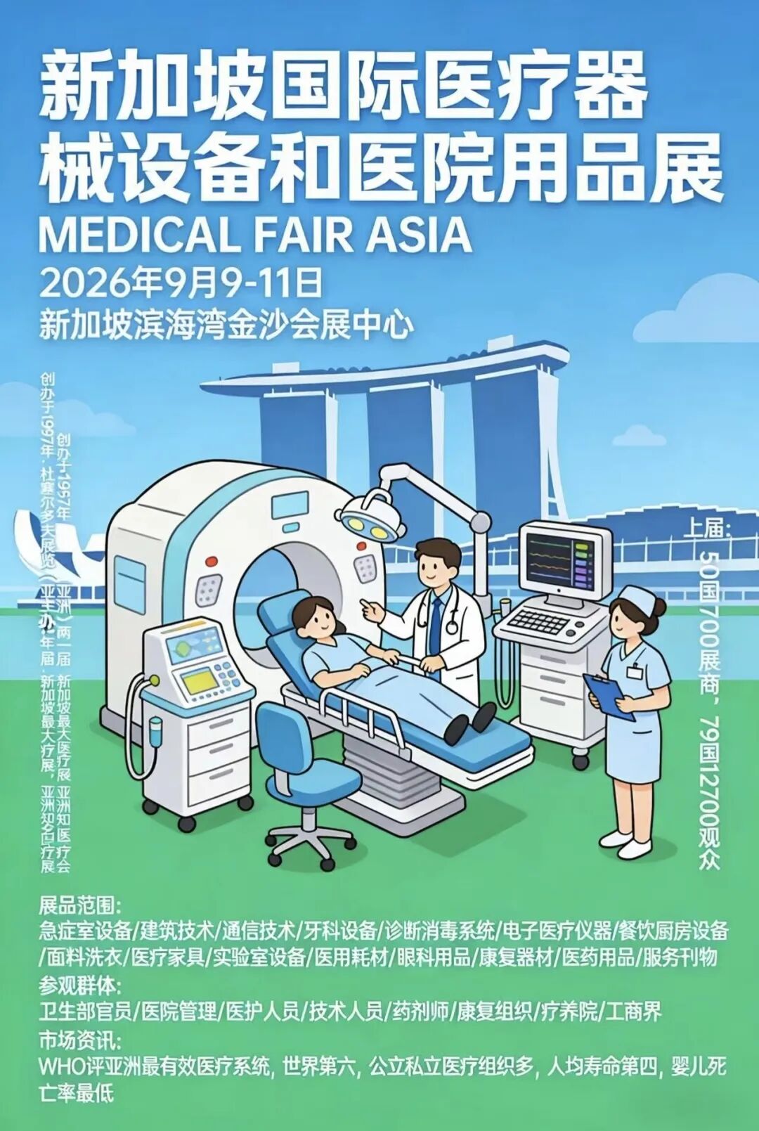 年一届的 新加坡医疗展,是亚洲顶尖医疗盛会,展会规模达10000㎡,汇聚830 家全球知名展商与12100 名专业买家,覆盖医疗设备、耗材、影像、IT、诊断等全产业链,配套专业论坛与精准商贸对接。权威主办、资源集中、商机稀缺,错过再等两年!!