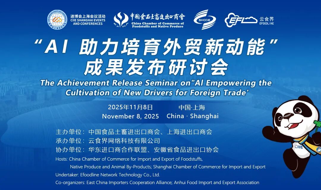作为连续八届进博会的深度参与者,云食界此次联合中国食品土畜进出口商会、上海进出口商会,在进博会期间举办“AI助力培育外贸新动能”成果发布研讨会,为食品农产品行业带来一场关于未来的深度对话。