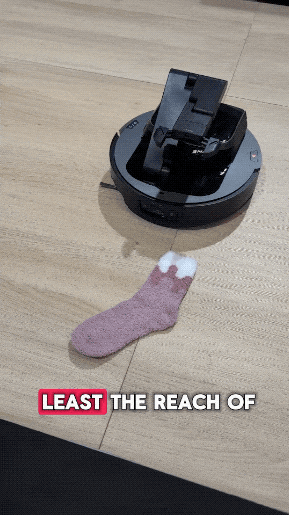 追觅 Cyber 10 Ultra 装上了机械臂,目的是把袜子、数据线等杂物捡起来,扔进背后的收纳筐,然后再扫地。