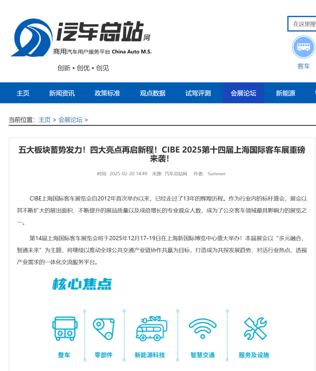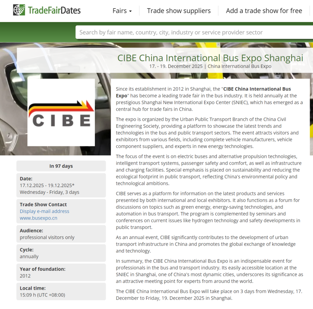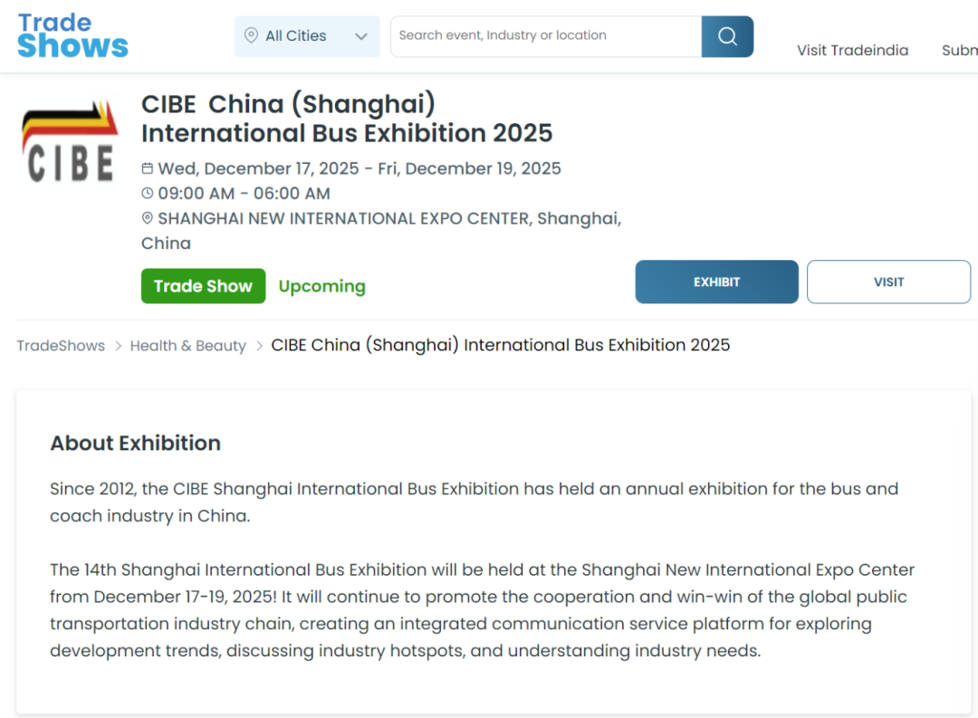 2025年12月17日-19日,CIBE 2025 第十四届上海国际客车展将以“多元融合,智通未来”为主题,在上海新国际博览中心开启为期三天的行业盛会。诚邀全球客车领域相关企业、采购团体及专业观众共赴盛会,共探行业新趋势,共拓合作新机遇!