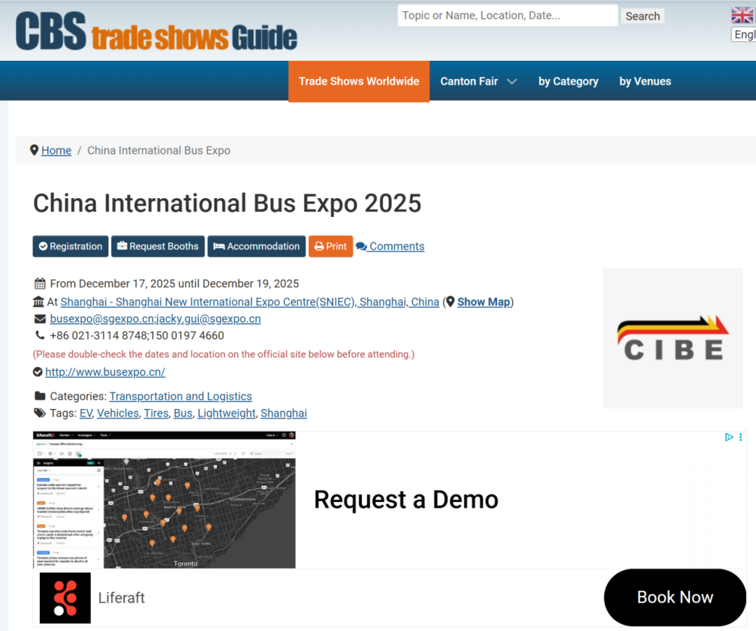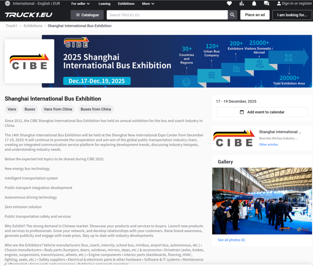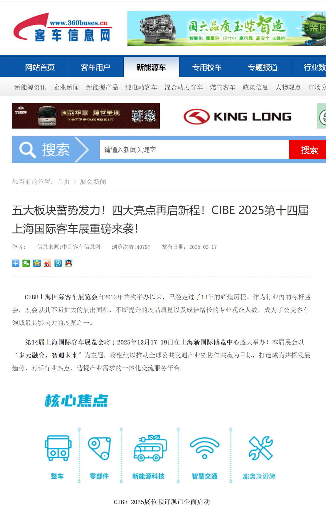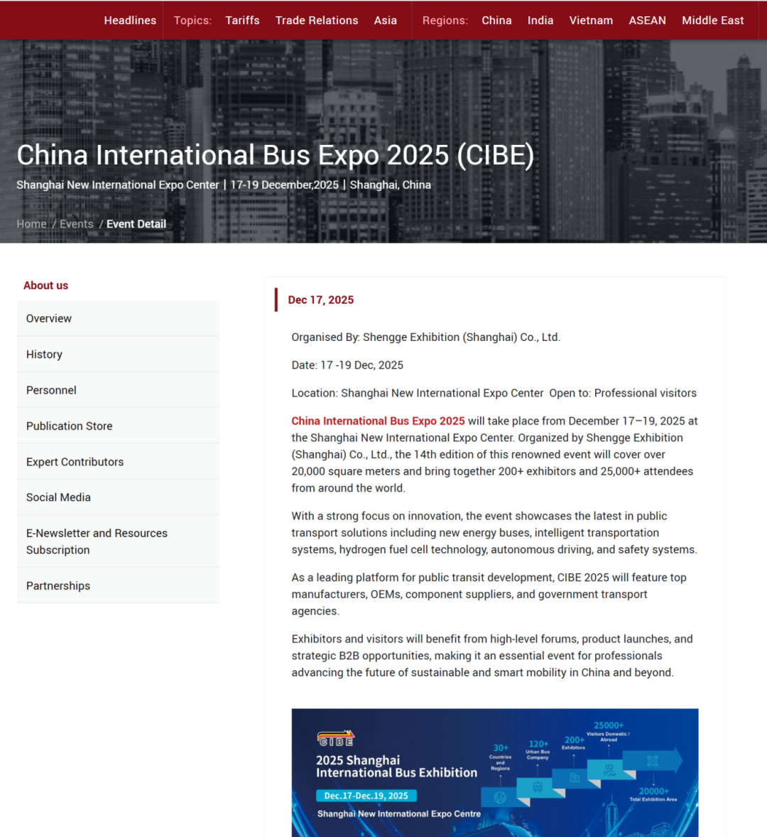 2025年12月17日-19日,CIBE 2025 第十四届上海国际客车展将以“多元融合,智通未来”为主题,在上海新国际博览中心开启为期三天的行业盛会。诚邀全球客车领域相关企业、采购团体及专业观众共赴盛会,共探行业新趋势,共拓合作新机遇!
