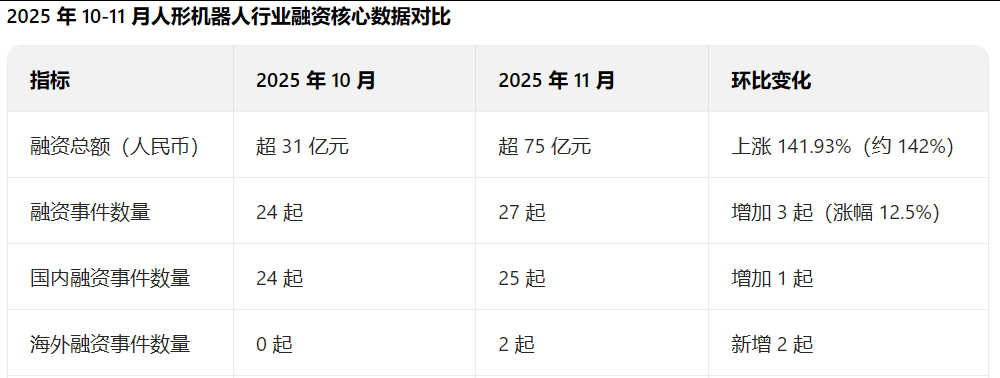2025年11月人形机器人行业融资热度迎来爆发式增长,据高工人形机器人发布的最新产业融资动态显示,融资额环比涨幅超140%,创年内单月融资新高。在技术突破与产业资本双重驱动下,赛道正从概念探索加速迈向商业化落地的关键阶段。我们基于高工人形机器人、证券时报、福布斯等权威机构数据,全面解析11月行业融资特征与发展趋势。11月人形机器人行业融资呈现“量额齐升”的显著特征,无论是与上月还是去年同期相比,均实现跨越式增长,资本对赛道的信心持续加码。据不完全统计,11月行业共发生27起融资事件,累计融资超75亿元,较10月的融资额环比暴涨141.93%。从融资结构看,大额融资事件成为增长核心:美国本体企业Apptronik筹集3.31亿美元(约24亿元人民币),国内清华系企业星动纪元完成近10亿元A+轮融资,两笔融资合计占当月总融资额的48%。对比10月数据,当月24起融资事件中仅乐聚机器人一笔15亿元融资撑起半壁江山,而11月除头部企业外,原力灵机、灵心巧手等15家企业均获得超亿元融资,资金分布更趋多元但头部效应依然明显。结合全年数据推算,2025年11月75亿元的融资额较2024年同期增长约120%。这一增长并非偶然——2025年前8个月国内人形机器人领域融资已达107起,累计超278.79亿元,远超2024年全年规模,亿元级融资从“稀缺品”变为行业常态。与去年同期相比,今年11月融资呈现两大变化:一是本体企业融资占比从35%升至52%,技术落地能力成为资本评估核心;二是产业链投资从单一本体延伸至传感器、灵巧手等核心零部件,投资生态更趋完整。11月融资事件中,中美两国企业占据主导地位,投资方向集中于本体研发与核心零部件突破,商业化落地能力强的企业更受资本青睐。本月27起融资事件中,25起发生在国内,2起来自美国,国内企业仍是资本布局的核心阵地。从全球视角看,中美两国形成双龙头格局:美国Apptronik估值达50亿美元(约354亿元人民币),计划年底前将融资规模扩大至5亿美元;国内星动纪元年内两次融资合计15亿元,估值已跻身行业前列。国内融资区域呈现“产业集群效应”,北京、广东、上海的融资事件分别占比32%、28%、16%,三地合计占据76%的融资份额,这与当地机器人产业政策支持、供应链完善度密切相关。本体企业:13家获投,除Apptronik与星动纪元外,极佳视界、深朴智能等8家企业完成多轮融资,无界动力、炽梦科技等5家2025年新成立企业实现融资突破,显示赛道“既有老将深耕,又有新兵入局”的活跃态势。其中松延动力表现亮眼,1个月内完成两轮共5亿元融资,其月交付量已突破100台,年底将提升至500台。核心零部件:6家关键企业获投,传感器领域的赛感智能、智子力控等4家企业,以及灵巧手领域的灵心巧手、傲意科技均获得资本注入。值得注意的是,灵心巧手在全球高自由度灵巧手市场占据超80%份额,2026年计划交付5-10万台,国产零部件竞争力显著提升。11月融资市场中,产业资本尤其是车企资本的深度参与成为最大亮点,同时“赛道内企业互投”的新型投资生态正在形成,推动行业资源加速整合。车企通过“投资+自研”双轨布局人形机器人赛道:星动纪元A+轮融资由吉利资本领投,北汽产投战略投资,这是汽车产业对具身智能领域的最大单笔投资;长安汽车11月更是拟出资2.25亿元设立智能机器人公司。地方国资同步加码,北京市人工智能产业投资基金、北京机器人产业发展投资基金等参与星动纪元融资,泉智博、蓝点触控等企业的融资中也均有地方国资身影,形成“政府引导+市场驱动”的资本矩阵。银河通用本月投资揽月动力和萝博派对,智元机器人投资炽梦科技并入股智身科技。高工人形机器人分析指出,同行投资者更能精准识别技术价值,通过投资布局生态圈,既推动外部创新,又能聚焦自身核心赛道,这种模式将加速行业优质资源集中。11月融资热潮背后,是技术突破与应用预期的双重驱动,但产业发展仍面临泡沫风险,监管层已明确释放“鼓励创新与防范风险并重”的信号。技术层面,国内人形机器人核心零部件国产化率从2024年的35%提升至52%,伺服电机、减速器等关键环节实现突破;应用层面,富士康已部署500台人形机器人参与电子组装,良品率达92%,物流、汽车制造等场景的落地验证持续推进。资本的持续注入将进一步加速技术迭代与规模化量产。发改委近期明确指出,当前行业存在“产品扎堆、重复建设”的非理性投资苗头。数据显示,2025年新成立的320家相关企业中,近60%缺乏核心技术,仅以“配件”“集成”等概念注册,概念性项目投融资占比达38%。对此,官方已提出建立技术门槛、规范资本投向等举措,未来缺乏核心能力的企业将逐步被淘汰。2025年11月的融资暴涨,标志着人形机器人行业从“资本预热”进入“价值深耕”的转折期。我们希望随着监管政策的完善与市场的自我筛选,人形机器人行业能够逐步告别野蛮生长,迈向“技术扎实、应用清晰、生态完善”的高质量发展阶段。