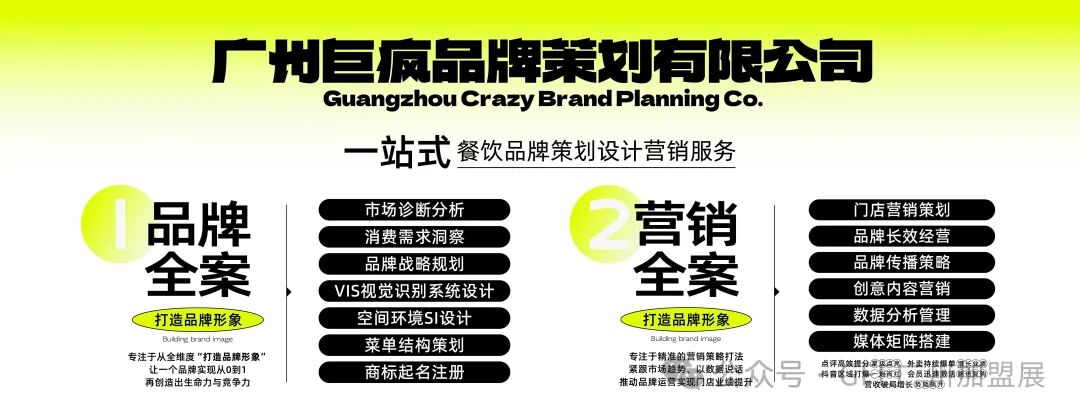 巨疯品牌策划,深耕餐饮领域十几年,专注研究全国餐饮市场与餐饮品牌营销策划,坚持站在品牌方的角度去思考问题,以策划落地为标准,以拉动数据增长为目标,致力于提升餐饮品牌与营收。公司专攻两大服务板块,一是品牌全案,二是营销全案。从前期的品牌商标注册、品牌战略,到执行期的品牌设计、空间打造,再到后期的营销托管,打通整条产业链路。