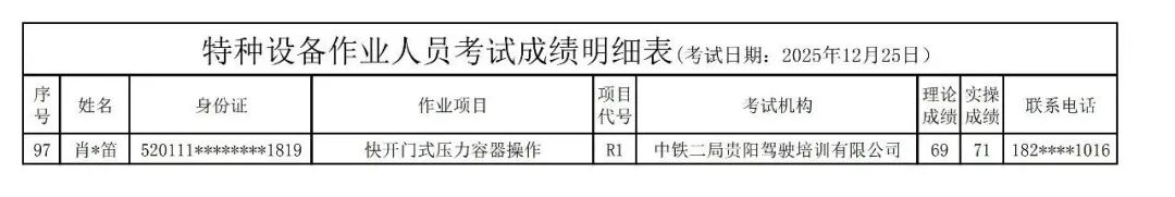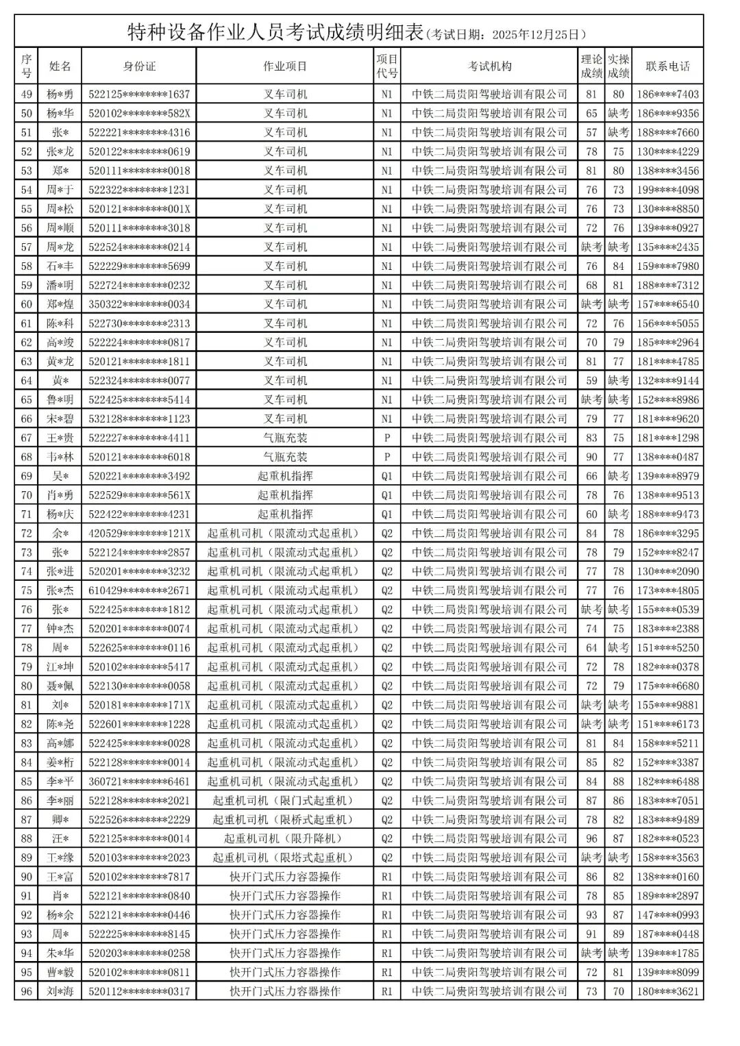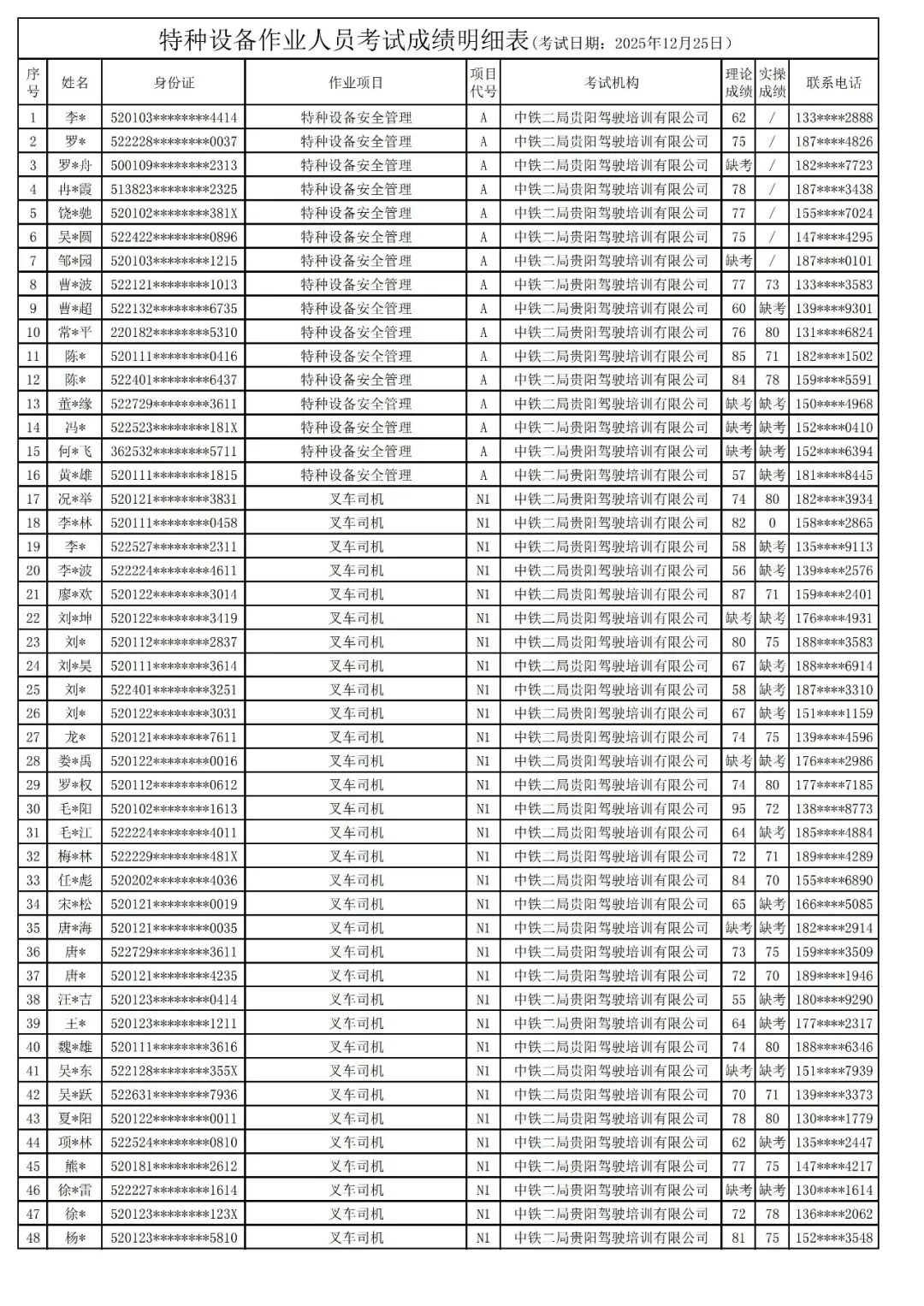 中铁二局贵阳驾驶培训有限公司于2025年12月25日组织开展2025年第29期特种设备作业人员考试,现将当期考试成绩明细公布如下: