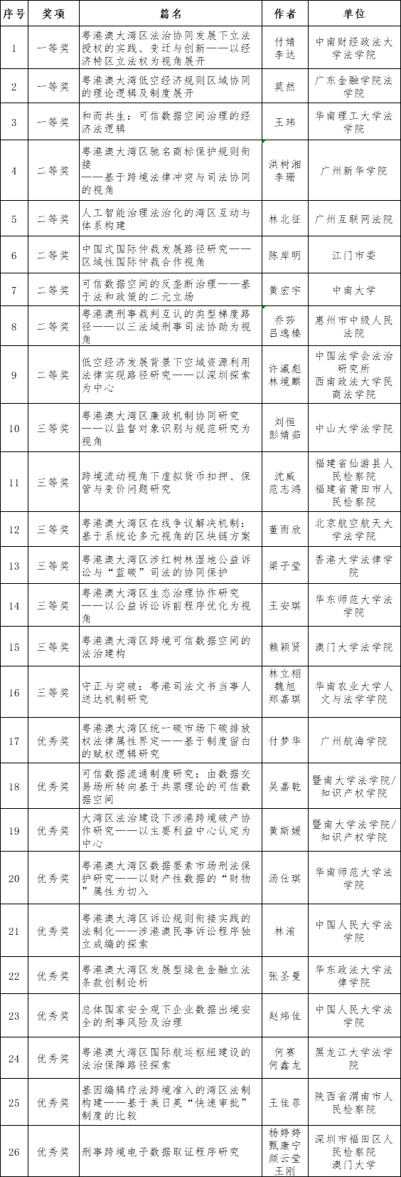 2025年4月至7月,在广大法学法律工作者的共同努力下,广东省法学会港澳台法学研究会、广州市法学会涉外法治研究基地发起主办的粤港澳大湾区法治论坛(2025)征文活动圆满结束,根据论文评选方案,经初评、复评、公示等程序,确定26篇获奖论文。