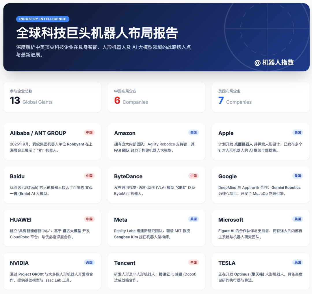 全栈巨头(华为/腾讯): -华为:依托盘古大模型与 CloudRobo 云端平台,主打“云-端-机器人”协同。 -腾讯:通过内部研发与外部联动(如越疆),在工业柔性化场景快速扎根。 场景降维(蚂蚁/字节/百度): -蚂蚁集团:2025 年 9 月上海展会上惊艳亮相的Robbyant R1已实现多场景试点突破,既能在展会现场化身 “机器人厨师” 完成全流程炒菜,也能在景区担任导览、在社区提供健康咨询,成为首个实现商业化试点的中国服务型人形机器人。其核心竞争力在于蚂蚁自研的具身智能大模型,让机器人具备多模态感知与自主决策能力。 -字节跳动:发布GR3 模型,以通用视觉-语言-动作能力直接灌溉硬件。聚焦机器人的 “感知 - 决策 - 动作” 全链路优化,ByteMini 机器人则作为技术验证载体,展现出轻量化、高灵活性的产品特点。 成本杀手(小米/优必选): 中国企业的核心优势在于“快速原型-快速迭代”,正在将硬件成本向汽车级价格带(数万美金)疯狂压制。