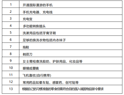 出发前请检查带上必备物品 ,最重要的是护照、身份证;其次如银行卡 ,手机 ,充电宝等; 日本天气多雨 ,气温和上海接近;请注意带折叠伞。必备药品如感冒通、 昏晕宁、黄连素、创可贴等 ,如果您有需要长期服用的药物 ,请随身携带;