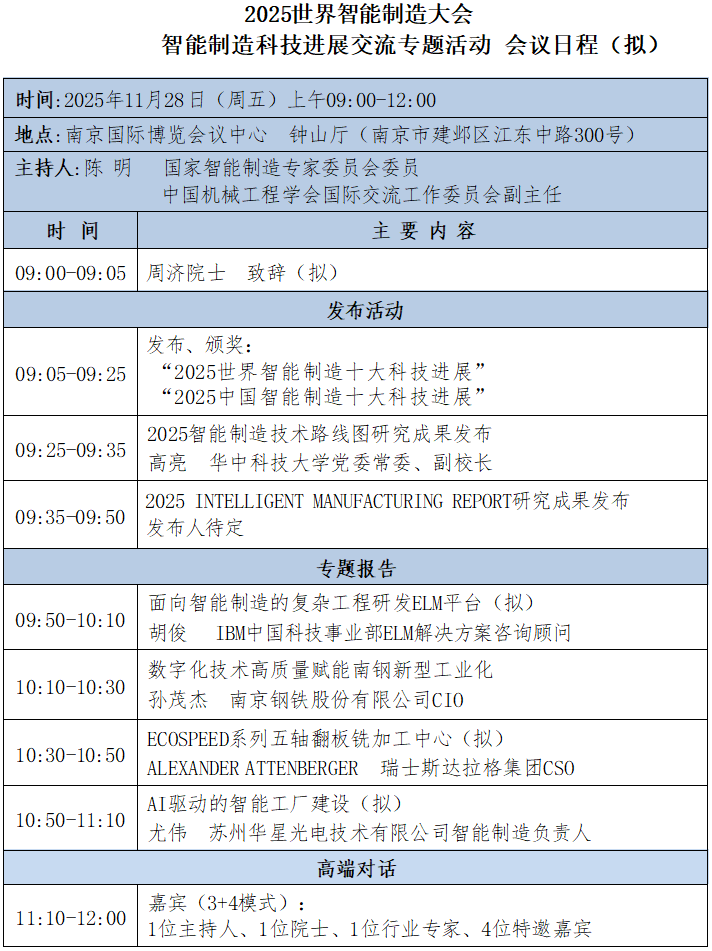 为了进一步交流和共享国内外智能制造解决方案的案例和实践经验,促进国内外智能制造优势技术和应用成果的合作与发展,定于2025年11月28日(周五)上午09:00-12:00在世界智能制造大会期间举办“2025智能制造科技进展交流专题活动”,旨在搭建智能制造典型应用的国际交流平台,交流和共享国内外智能制造解决方案的案例和实践经验,引入有示范作用、可复制、可推广、效益效率并重的智能制造解决方案,共享全球智能制造科技成果,启迪思想、促进交流与合作。
