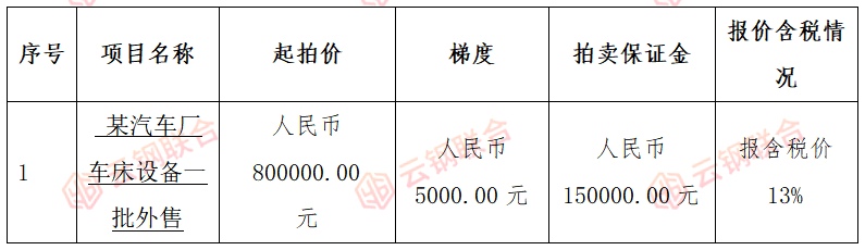 受委托人委托,我公司定于2026 年 01 月 25 日 10时 00 分在“云钢联合”云钢拍卖系统对“某汽车厂车床设备一批外售”进行整体打包公开竞价处置(不接受现场竞拍),拍卖网址:http://www.yungangunite.com。 2026 年01月 23 日至2026 年01月24 日在标的物所在地进行预展,报名截止时间为2026 年01 月 24 日18时 00分。有意竞买者请按本公告规定缴纳拍卖保证金并携带有效证件办理竞买手续,银行转账以实际到账为准。