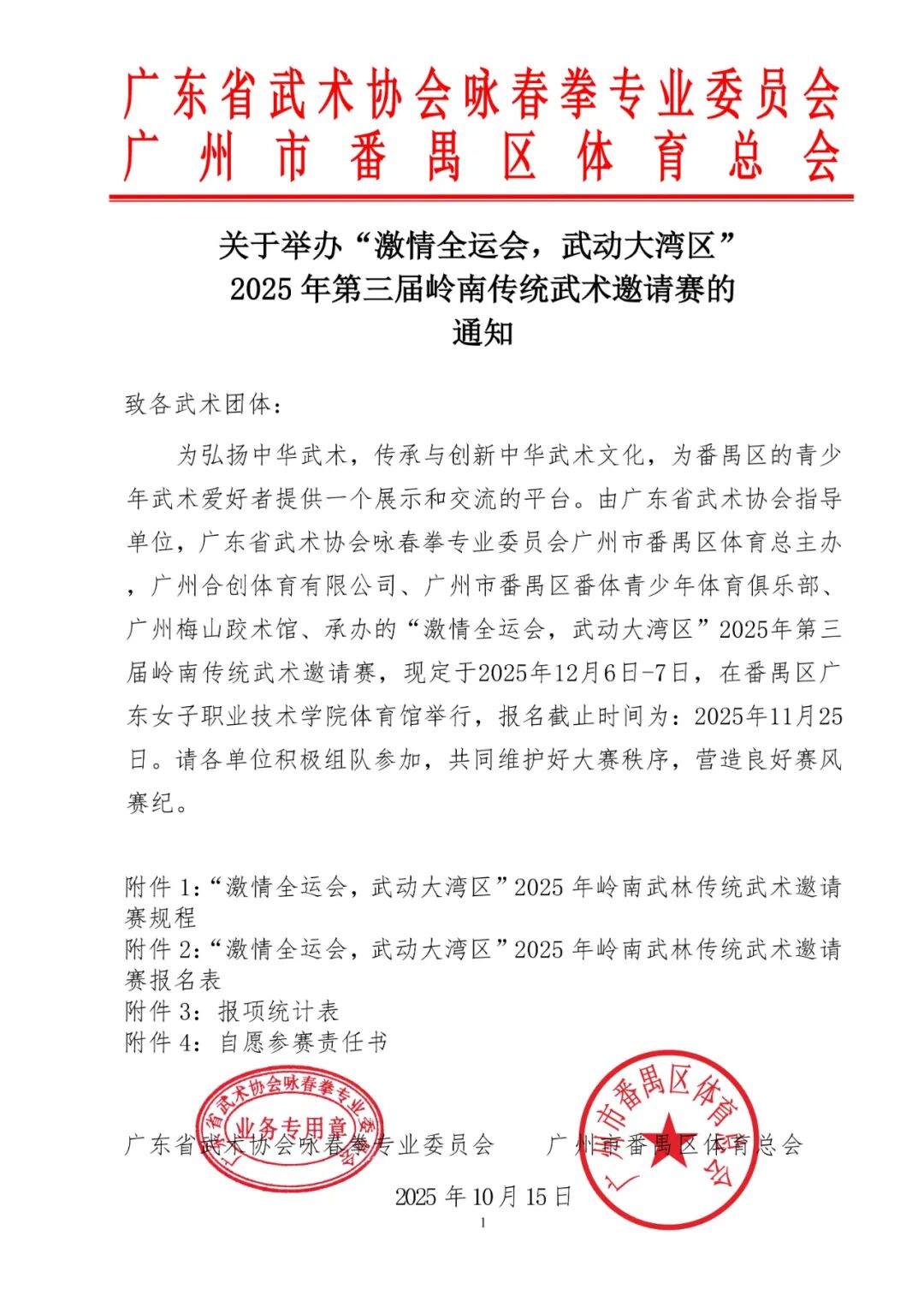 附件1:“激情全运会,武动大湾区”2025年岭南武林传统武术邀请赛规程.docx附件2:“激情全运会,武动大湾区”2025年岭南武林传统武术邀请赛报名表.xlsx附件3:报项统计表.xlsx附件4:自愿参赛责任书.docx