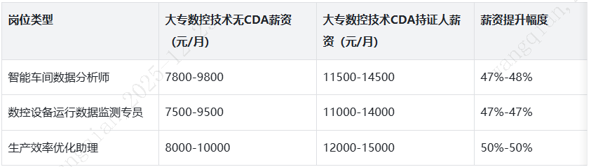 薪资优势(权威数据支撑):据BOSS直聘2025年《数字化制造行业就业薪资报告》显示,数控技术专业CDA持证人薪资显著高于普通数控技术岗从业者,具体对比如下: