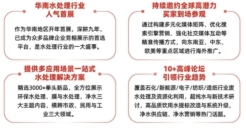 展会横跨工业、市政、民用、水环境等领域,为来自国内外的优质商家、买家、专业观众打造一个集买家会晤、商贸洽谈、新品发布、高峰论坛、媒体曝光、现场交易等功能为一体的高品质水处理商贸平台!
