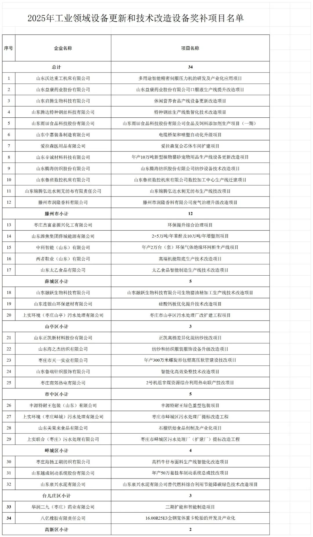 根据《枣庄市“6+3”产业链链长制运行机制工作方案》(枣政办字〔2025〕7号)精神,市工业和信息化局组织开展了2025年工业领域设备更新和技术改造设备奖补项目评审工作,经企业申报、区市推荐、中介评审等程序,拟对山东沃达重工机床有限公司等34家企业给予设备购置奖补支持。现将通过评审的名单(见附件)予以公示,公示期为5个工作日。
