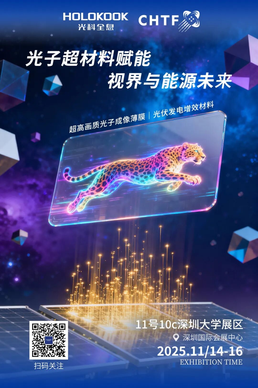 在能源与显示技术的交汇点,一场由光子超材料引领的变革正在发生。深圳市光科全息技术有限公司,作为国家高新技术企业和“专精特新”企业,将携两大创新成果亮相第27届高交会,为您呈现光学的未来。从能源增效到视觉革命,光科全息让每一束光都创造更大价值。11月14-16日,深圳国际会展中心,期待与您共探光的无限可能!📅 展会信息时间:2025年11月14日-16日地点:深圳国际会展中心(宝安)11号馆展位:10c 深圳大学展位