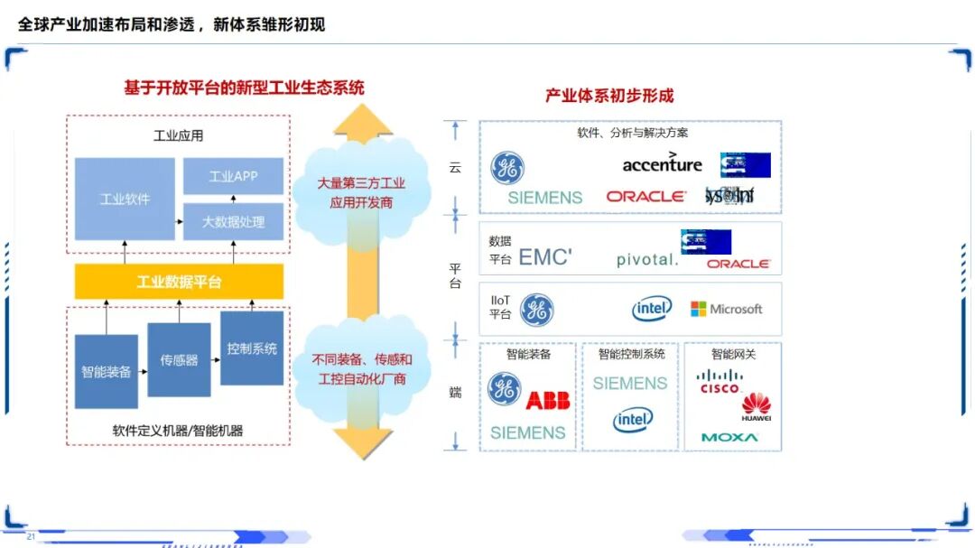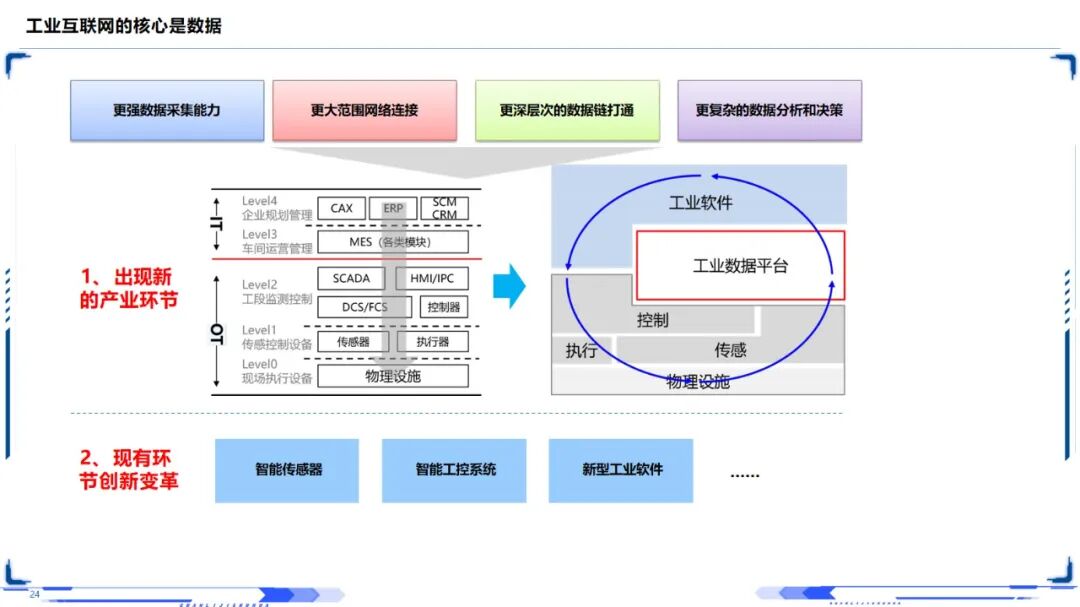 工业互联网是其技术的核心,其关键是数据智能。在此基础上,结合工业物联网技术、大数据分析技术和人工智能技术,提出了一种“数据获取—综合处理—建模分析—决策控制”的闭环优化方法。该体系结构涵盖了设备-网络-应用的多个层次,包括了智能设备和传感器等硬件部分,以及网络互连和身份解析等底层支持部分,并兼顾了设备-网络-应用各个环节的安全问题。