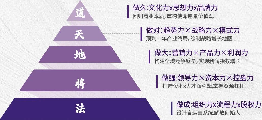 重构商业认知 突破发展桎梏 打破经验惯性,建立跨周期战略思维框架,掌握产业终局研判能力,重塑企业价值坐标 | 构建增长逻辑 贯通管理闭环 系统习得“道天地将法”管理体系,打通战略设计、组织执行与资源协同的全链条能力 |