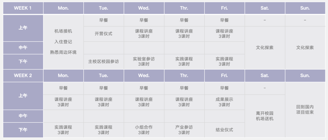 费用包括课程、签证服务及保险、住宿、接送机交通与活动费用、项目管理服务。