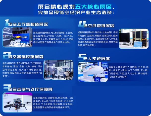 五大展区覆盖低空经济全场景,从飞行器制造到供应链服务,上下游合作伙伴一应俱全,洞悉产业创新链条。