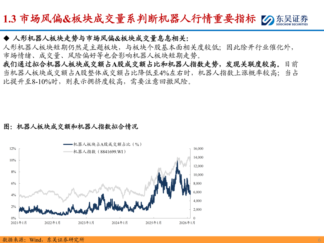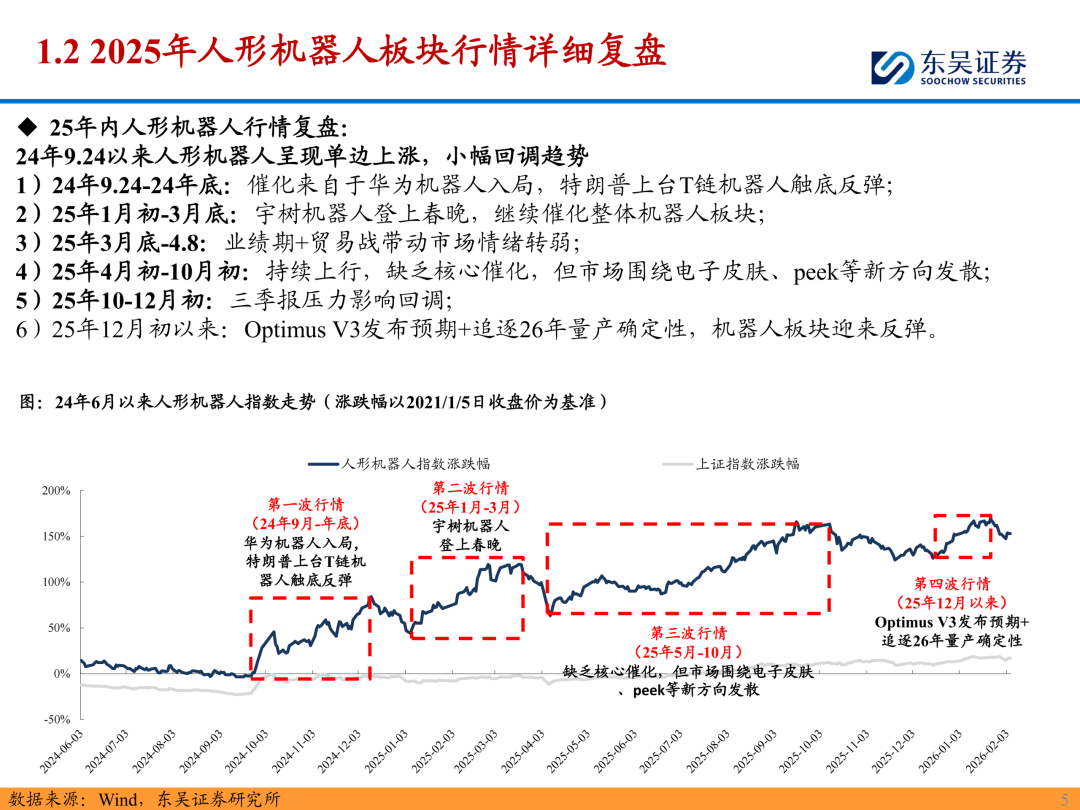 2024年9.24以来人形机器人板块呈现单边上涨,小幅回调趋势,核心催化包括华为机器人入局,宇树登上春晚等等;展望26年,我们认为板块会逐步收敛,一方面特斯拉Optimus从实验室阶段正式走向量产,因此需要关注量产确定性标的,其次预期差我们认为来自于一些新技术方向(提升效能or大幅降本)。