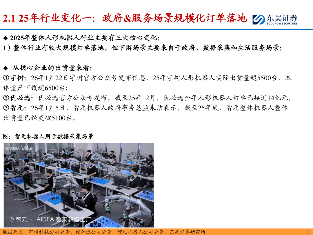 1)整体行业有较大规模订单落地,但下游场景主要来自于政府、数据采集和生活服务场景,其中宇树、智元和优必选机器人出货量靠前。