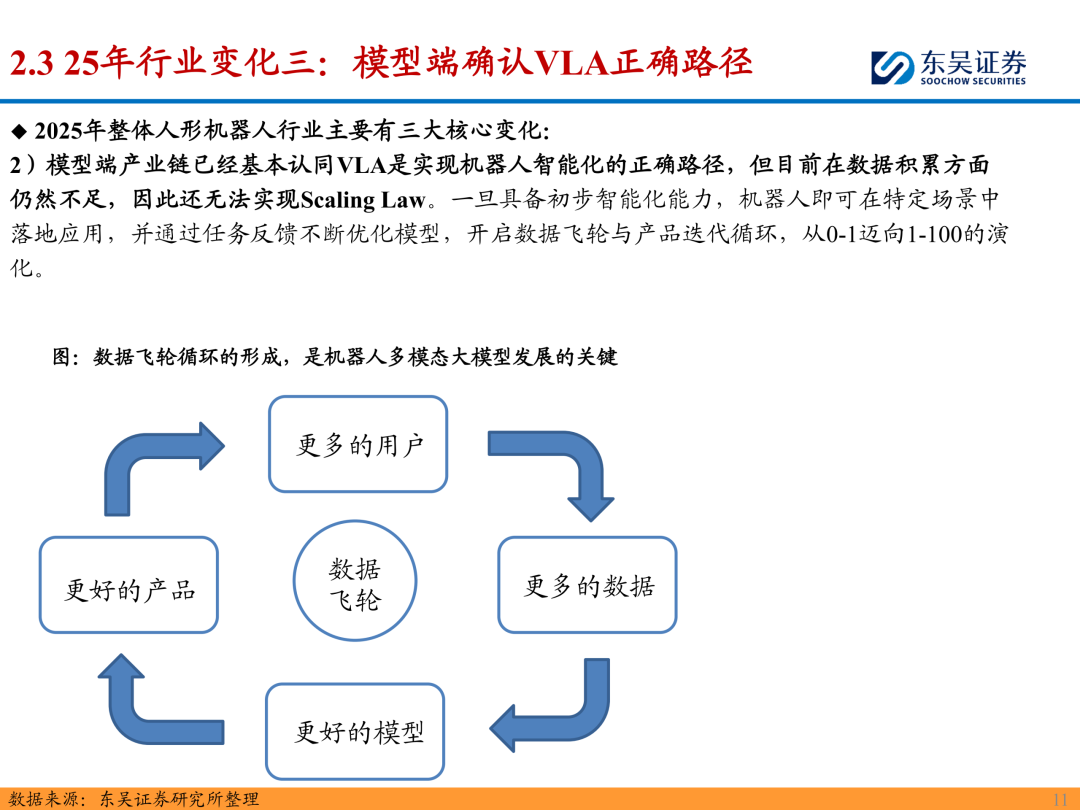 3)模型端确认VLA正确路径,部分模型初具智能化,但由于数据量短期不足,Scaling Law正循环还未形成。