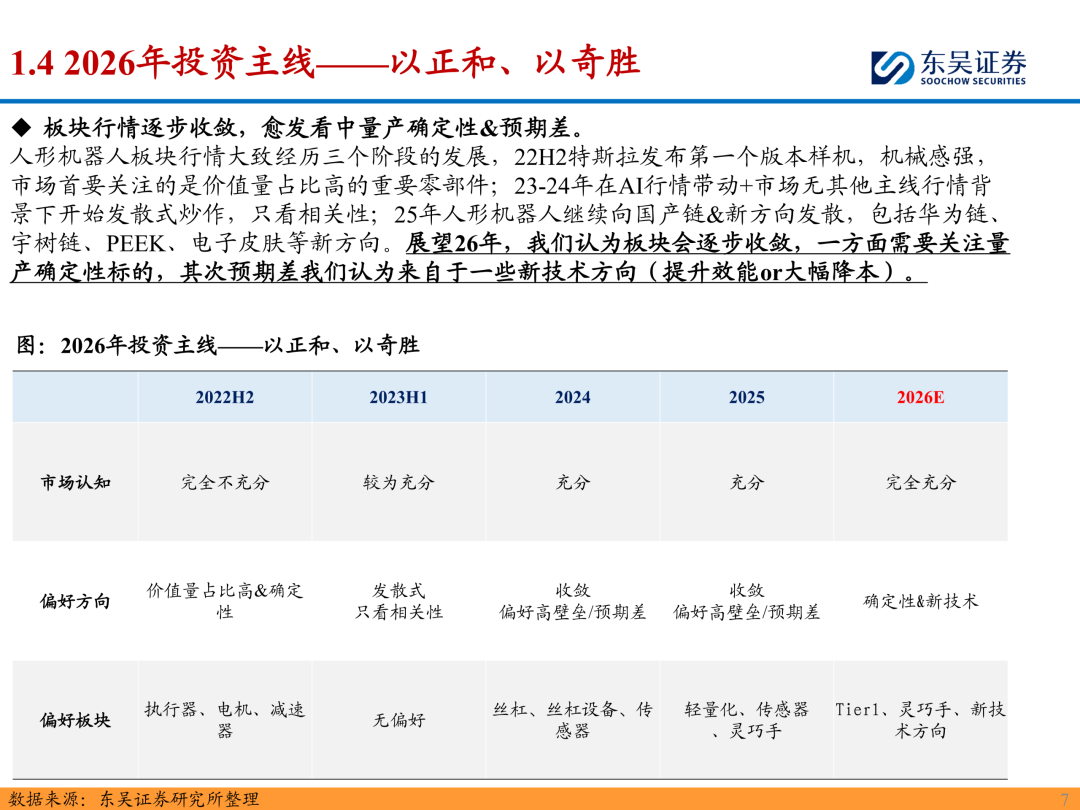 1)以正和:特斯拉Optimus迭代顺利,26年开启大规模量产元年,因此确定性方向主要包括Tier1&丝杠&减速机等环节,供应链逐步进入缩圈状态。此外国产链方面宇树、智元等头部玩家有望在26年批量上市。