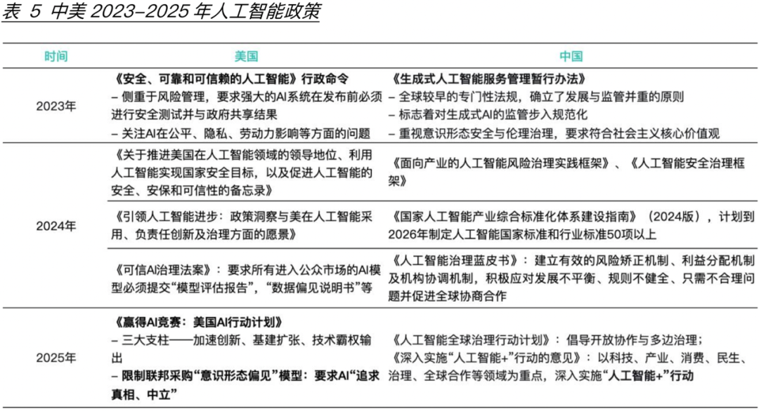 2023年以来,中美在全面发展人工智能产业的同时,对信息安全、社会伦理、制度监管及模型政治偏见等领域的政策引导逐渐增多。对内中美两国积极开展AI治理保障社会信息安全,美国先后颁布《安全、可靠 和可信赖的人工智能》行政命令、《AI行动计划》等,既要求大力发展人工智能三大支柱产业也要求加强人工智能的治理,尤其在2025年联邦政府强调限制采购具有“意识形态偏见”模型(表5);中国则在2023年就要求生成式人工智能需要重视意识形态和伦理治理,要求其符合社会主义核心价值观并随后发布多项AI治理政策。对外中美两国在积极推行“AI外交”跑马圈地,截至20254月,美国借助OECDG7等推动“可信AI”框架的全球签署并成功让42个国家采纳其框架,成为国际技术贸易的“信任通行证”;中国则在联合国平台提出:全球AI发展倡议“并于金砖国家启动“AI伦理合作沙箱”等实施其国际影响力。美国这些政策在强调两件事情,即大模型“本土化”意识形态的必要性以及人工智能的社会伦理和法律约束。