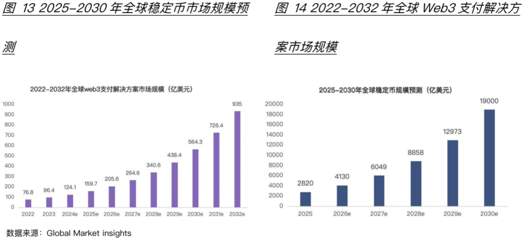 稳定币应用场景广,市场空间大。2025年全球稳定币规模在2820亿美元,渣打银行预测2030年稳定币规模将达到1.9万亿美元。而与稳定币应用密切相关web3RWA领域市场前景也非常客观:据Global market insights报告,2023年全球web3支付解决方案(包括代币化资产支付、加密货币支付、基于NFT支付等)市场规模有96.4亿美元,预计2032年达到935亿美元;波士顿咨询预测,2030RWA市场规模将攀升至16万亿美元,稳定币30%-50%份额将会流入RWA资产(图13、图14)。