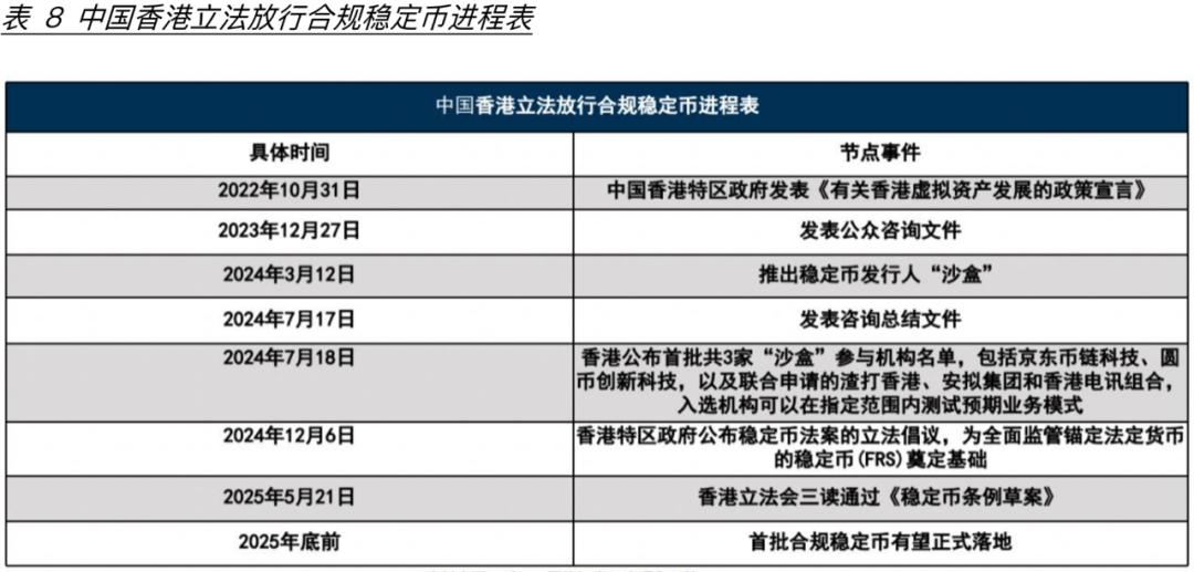 更重要的是随着各国加入web3和加密货币等领域,数字资产和数字货币将成为难以逆转的趋势,这也意味着各国以本国法币为锚定价值的稳定币会逐渐进入市场,稳定币市场的角逐到最后本质上将回归到国家法币竞争力的角逐;而当下在稳定币领域由美元主导的USDT掌握绝对话语权,如果中国不积极布局稳定币,那么会在稳定币甚至web3RWA活动中再次出现“美元霸权”,而香港是中国发展稳定币的不二选择。2022年就发布《有关香港虚拟资产发展的政策宣言》,随后在这一领域先后发表公众咨询文件、推出稳定币发行人“沙盒”进行相关业务测试。最终于2025521日通过《稳定币条例草案》,这样意味着香港当局对虚拟资产的监管迈上新的台阶(表8)。