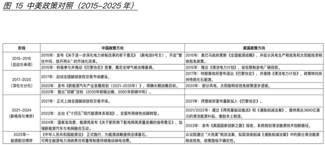 同时期美国从奥巴马政府到特朗普和拜登政府经历了能源政策的反复变化。在奥巴马和拜登政府,美国加入《巴黎协定》并积极推进新能源的发展;但是在特朗普执政时期美国对新能源的态度暧昧,2017年美国先退出《巴黎协定》并废除《清洁电力计划》,转向传统能源,在2025年再次提及放开能源限制并减少了对新能源的补贴政策(图15)。
