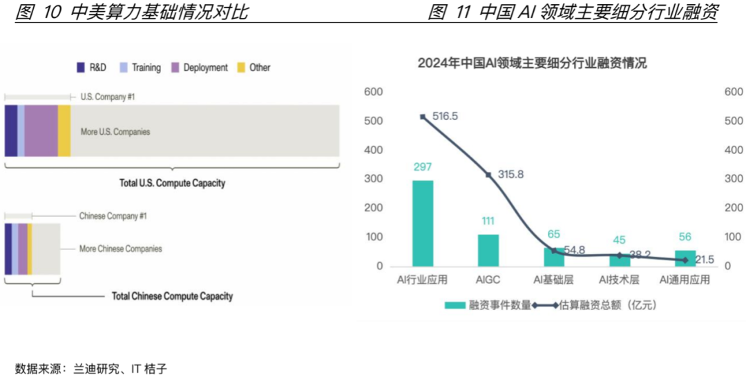 2.0政策的引导下,中美在人工智能领域都迎来了各自的爆发期。虽然在芯片和数据中心等方面美国处于绝对领先的位置,但是在大模型性能和算法能力方面中美的差距在缩小。2022-2024年人工智能专家/模型统计数据来看(图9),中国在人工智能领域论文的被引用量占比和专利授权数量方面都超过美国,标志性模型数量虽然不及美国但也远超其他国家和地区。兰迪公司20255月发布一篇文章回应“中国AI技术超车论”,文中也表示中国的模型性能在逼近美国,但美国在算力基础(图10)、制度生态与国际治理机制方面占据决定性优势;其作者表示中美的AI竞争不是比“谁的模型更聪明”,而是关于“谁能更可持续的运营AI生态系统”的制度博弈(海外智库观察,2025)。与此同时生成式人工智能技术(AIGC)的飞速发展带来了新的问题,这也从另一个角度印证了这个说法。