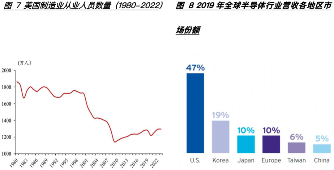 从数据来看2010年后美国制造业从业人员锐减(图7),直到2020年其从业人员仍不足21世纪初的三分之二,且其高新科技产业的关键材料和产品高度依赖进口,《美国科学与工程指标2018》数据显示:随着企业持续投资研发设施并于学术界的合作增加中国工业有望向新兴和复杂的技术方向发展,在中端高科技产业,中国现在占主导地位,其全球份额在过去十年间几乎增长了两倍,达到32%