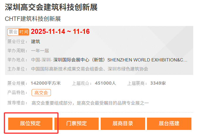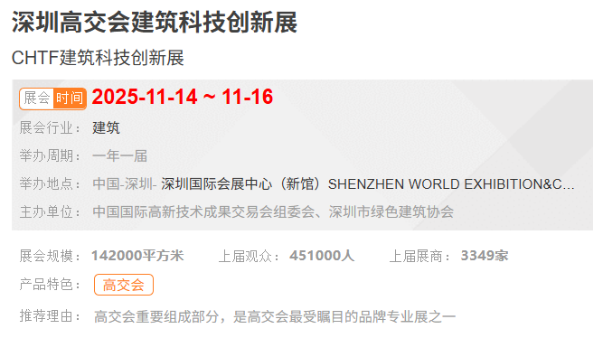 给城市更新领域带来了重大的利好,主要为完善新型城镇化战略、实施城市更新行动、提升城镇化发展质量等等,对建筑行业政策支持力度强劲,建筑科技创新有广阔应用需求和空间。深圳高交会建筑科技创新展(CHTF)以更健康、更安全、更宜居为目标全面推进城市更新,是实现城市高质量发展的客观要求。