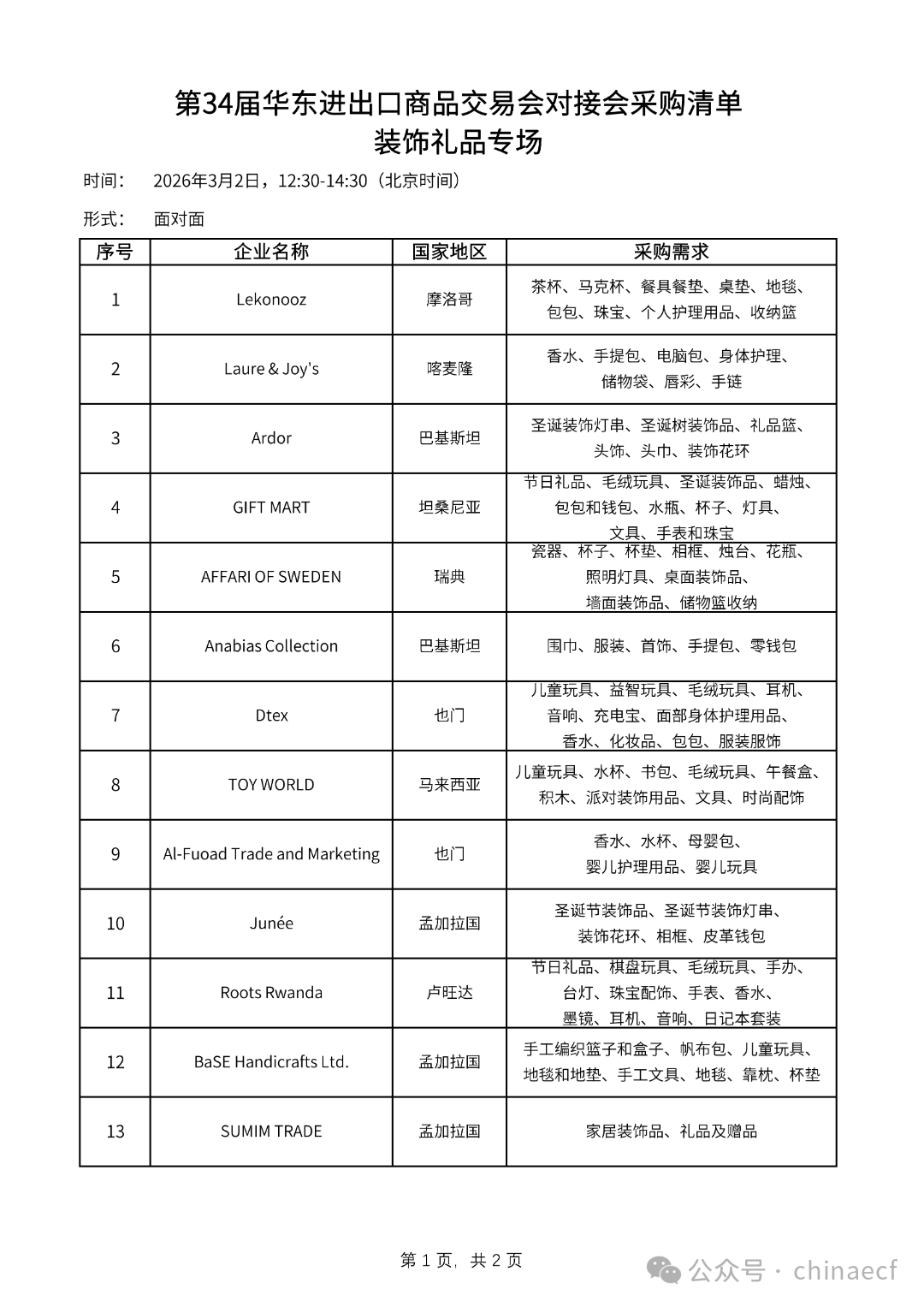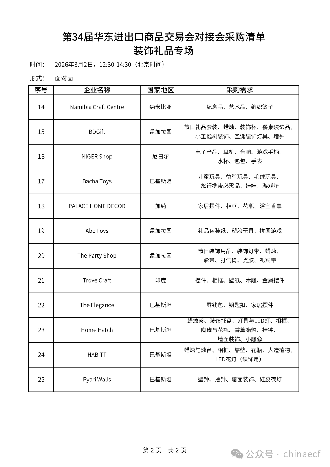 面向参展企业,第34届华交会专门开展“一对一”“面对面”对接会7场(家庭用品专场、服装服饰专场、装饰礼品专场、纺织面料专场、欧美专场、东南亚专场、日韩专场),以更好地服务、提高参展企业的成交效率。