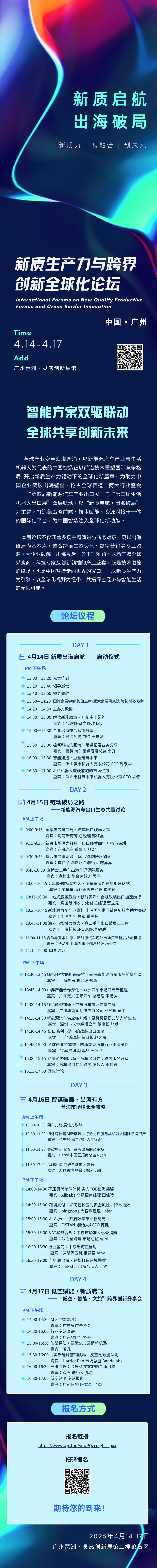 本届论坛活动将于4月14日-17日举办,为期四天,主办方共筹备了四场主题论坛,分别是:“新质出海启航——启动仪式“、“链动破局之路——新能源汽车出口生态共赢讨论”、“智谋破局,出海有方——蓝海市场增长全攻略”以及“低空赋能,新质腾飞——‘低空、智能、文旅’跨界创新分享会”。