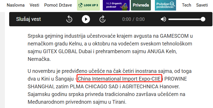 在塞尔维亚工商会和塞尔维亚开发署的组织下,2025年塞尔维亚食品企业即将参加俄罗斯国际食品展、海湾食品展等展会。今年11月,还将参加在中国上海举办的进博会。