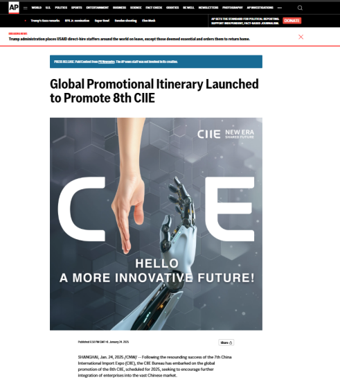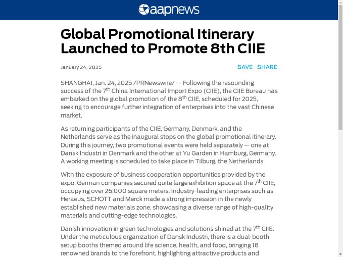 1月24日,美联社、澳大利亚联合通讯社、日本共同社、荷兰ANP通讯社等4家主流通讯社及2家德国主流媒体Presseportal.de和wallstreet: online发布新闻稿件《第八届进博会全球推介活动启动》。该文在海外媒体报道转载量达1689次,阅读量达5.4万次。