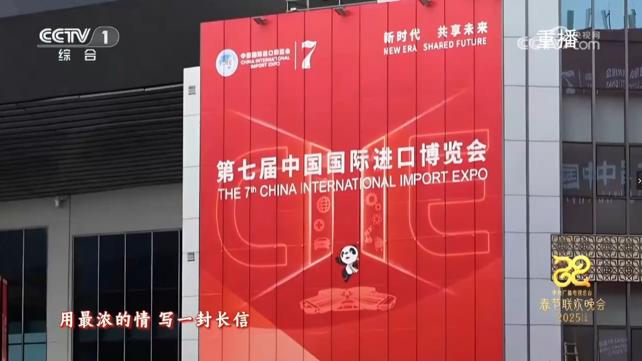 其中,在由三十多位来自各行各业的劳动者代表演唱的歌曲《伟业》的背景视频中,第七届进博会相关画面得以展示。