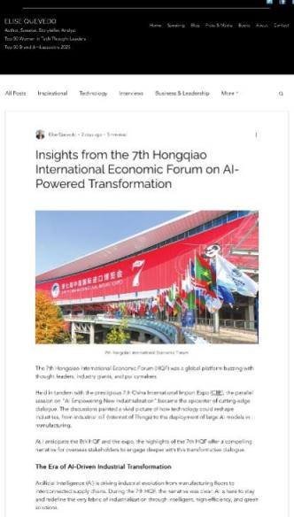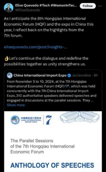 1月27日,英国科技行业意见领袖Elise Quevedo在个人网站发布关于第七届虹桥论坛及进博会的推广文章,并在个人海外社交媒体平台进行转发,触达受众27万人次。