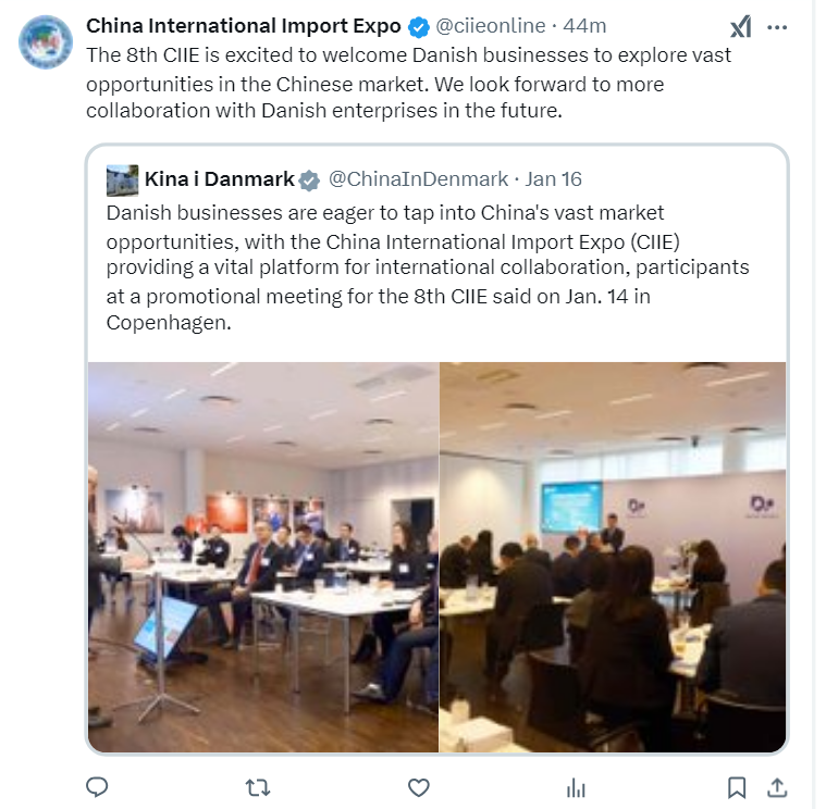 1月16日,中国驻丹麦大使馆发帖称,在哥本哈根举办的第八届进博会推介会上,丹麦企业表示希望借助进博会这一重要国际合作平台,拓展中国市场。进博会海媒账号点赞并转发表示,热忱欢迎丹麦企业前来探索中国市场,期待未来双方能够开展更多合作。