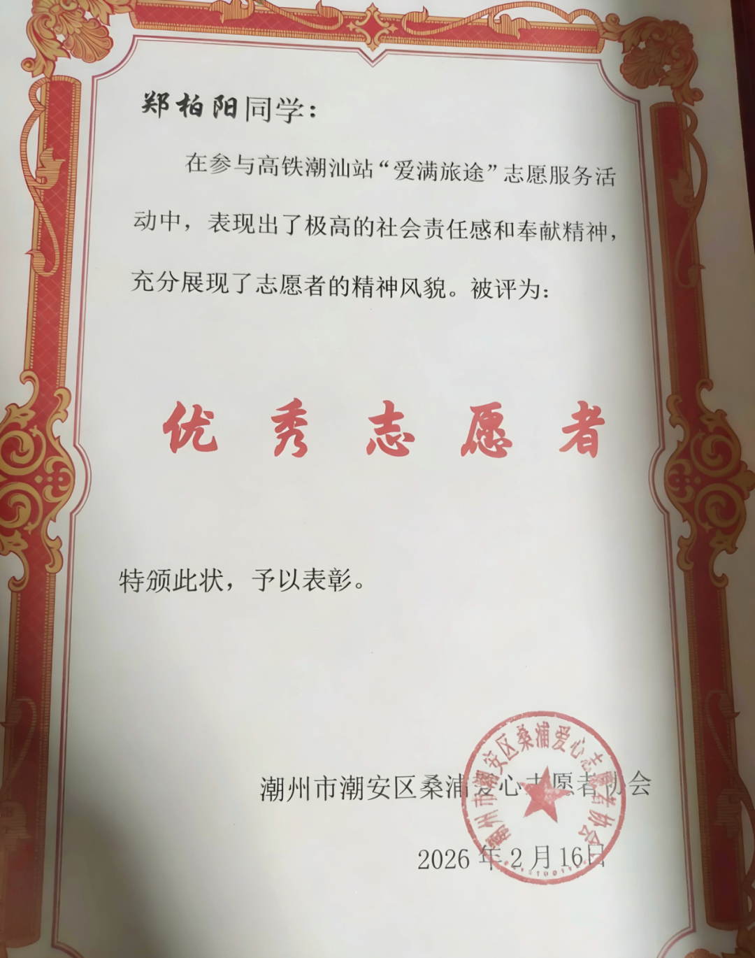 这个寒假,机器人2502班郑柏阳选择了一种特别的方式度过春节,回到家乡的高铁驿站,成为一名高铁服务驿站志愿者。说来也巧,正是在腊月二十九那天,当整座城市都沉浸在团圆的前奏中时,他穿上了那件红色的志愿者马甲,正式开启了为期一周的春运服务。