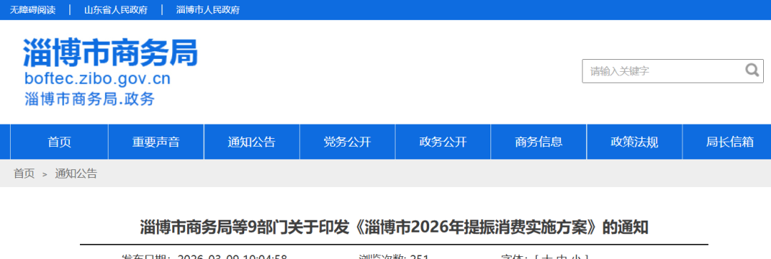 山东省:淄博市商务局等9部门关于印发《淄博市2026年提振消费实施方案》的通知