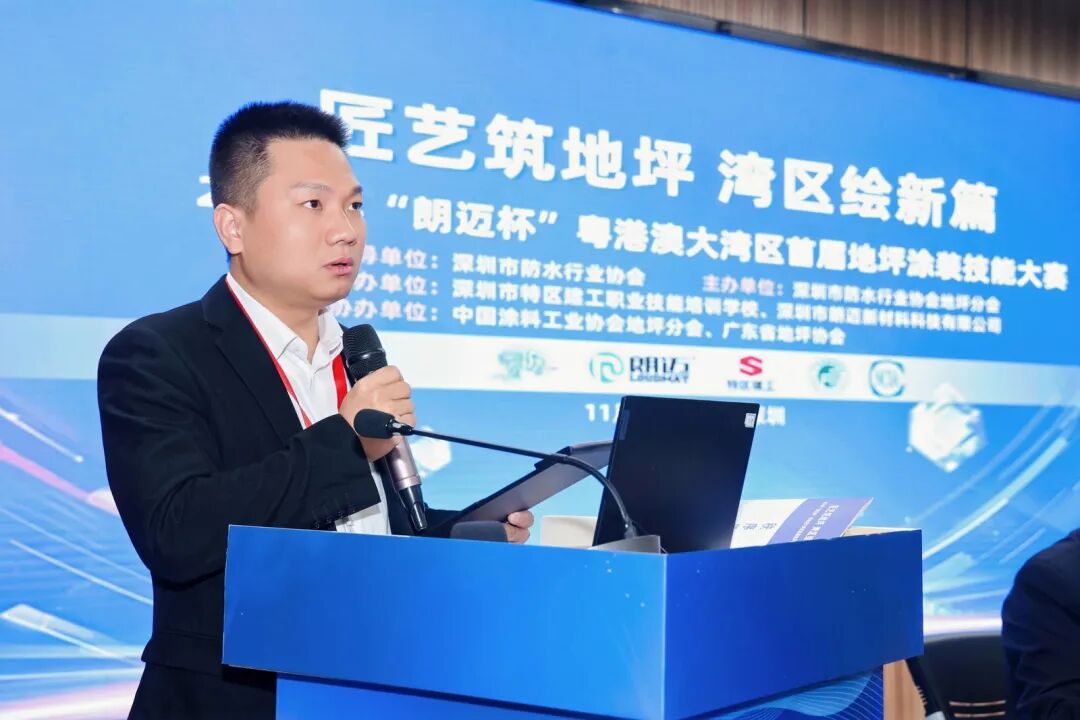 随后,中国涂料工业协会地坪分会秘书长 肖亮发言。他称粤港澳大湾区地坪行业发展迅猛,作为创新高地兼具技术与人才资源优势,地坪工艺及人才素质直接影响工程质量与行业未来,本次大赛是技能检阅、交流提升与弘扬工匠精神的关键平台,衷心感谢深圳防水协会及地坪分会支持。肖亮提到协会关注区域产业协同,希望以赛事为起点搭建常态化交流机制,深化跨区域合作、推动企业研发投入与工艺材料升级,让绿色高效技术惠及更多项目,愿深化合作共促行业发展,祝愿选手赛出水平、大赛圆满。