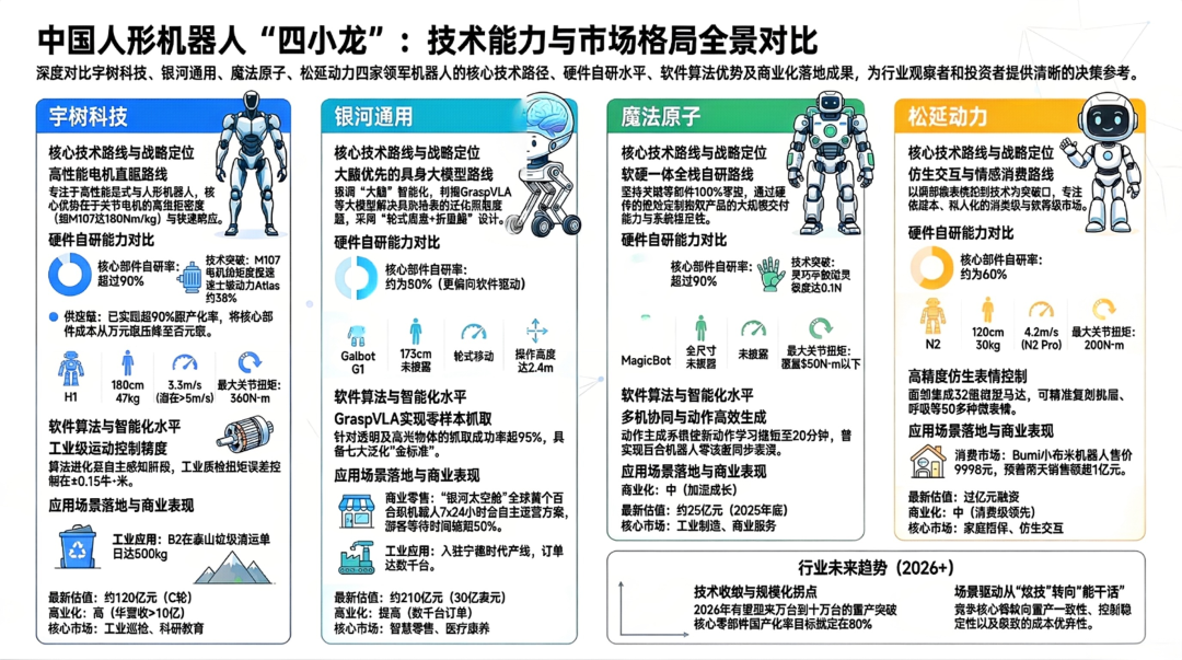 2026年马年央视春晚的舞台上,出现了一个令全球科技界屏息的画面:宇树科技、银河通用、魔法原子、松延动力,这四家代表中国机器人顶尖实力的公司携手同台。从高难度的腾空回旋踢到细腻的仿生微表情,再到上百只机器熊猫的集群共舞,这不再仅仅是一场“实验室炫技”,而是一次向全民宣告的产业阅兵。