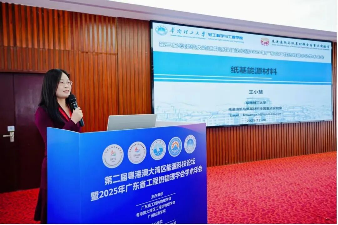 大会特邀报告下半场由学会副理事长/秘书长、暨南大学王卫良教授主持。国家高层次人才、华南理工大学王小慧教授作题为《纸基能源材料》的大会特邀报告,介绍了纸基功能材料在能源领域的研究进展与应用潜力;学会理事、华南理工大学董美蓉教授作题为《能源低碳转换过程智能感知与状态诊断》的大会特邀报告,围绕能源系统低碳转换过程中的智能感知与运行状态诊断方法进行了深入阐述;学会理事、广州航海学院仲皓想教授作题为《绿色高效的锂电池水系粘结剂》的大会特邀报告,介绍了相关材料体系的设计思路及其在绿色储能技术中的应用前景。报告从不同角度展示了工程热物理与能源科技领域的最新研究进展,引发与会代表的热烈讨论。