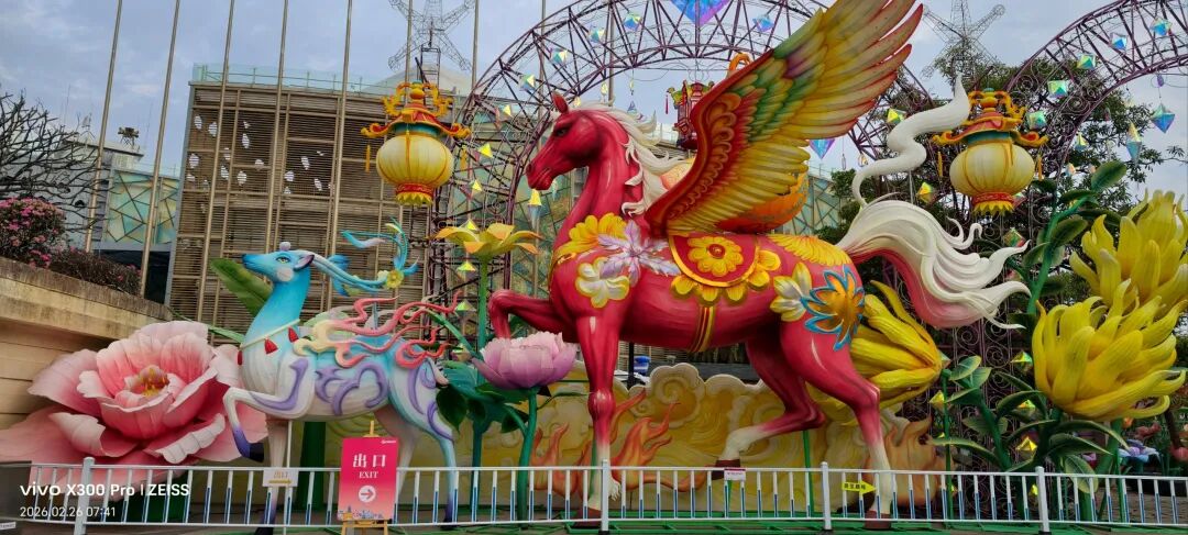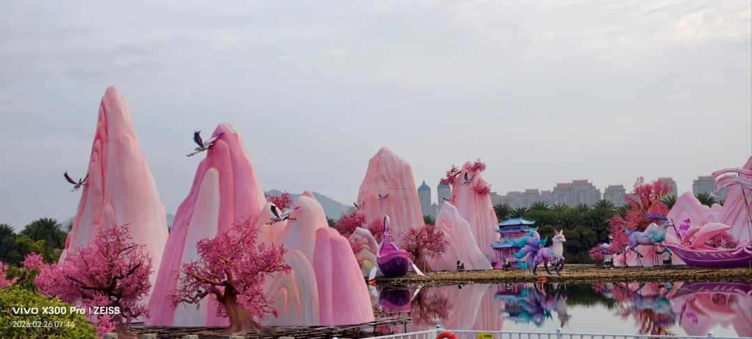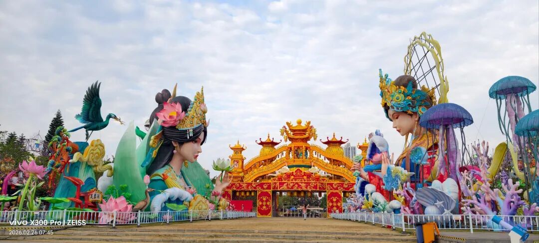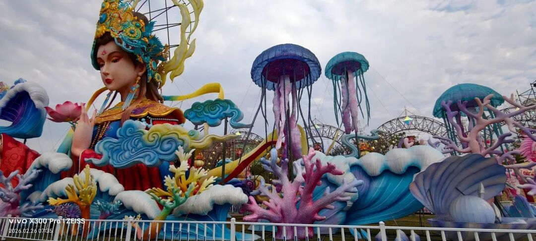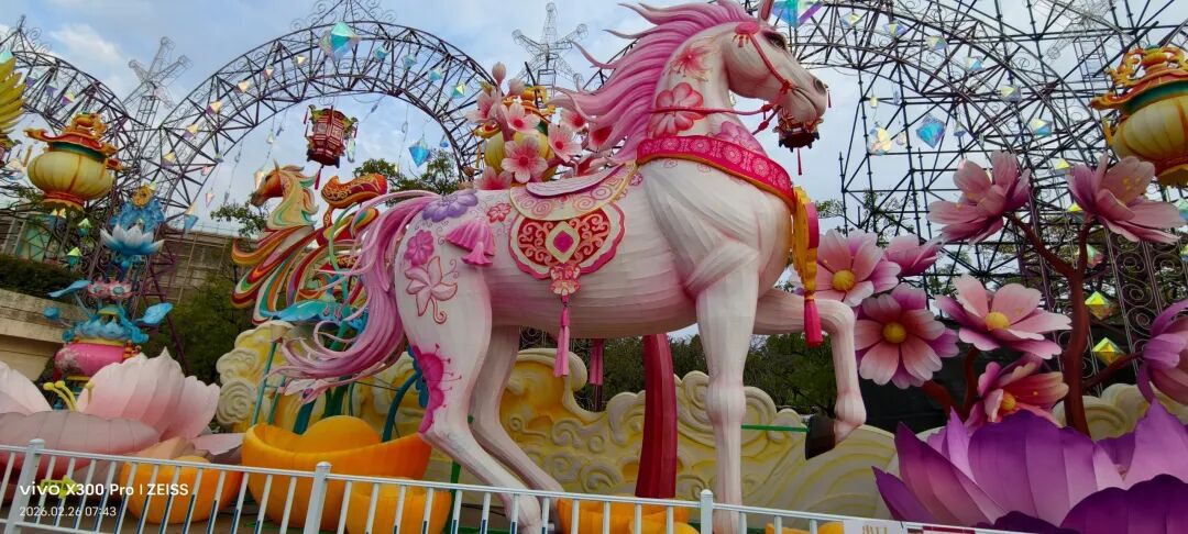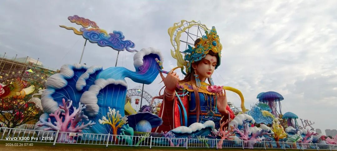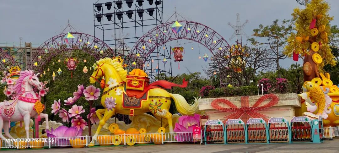 福建超大新春灯会,占地约270亩,共31组灯组(5组特大型+10组大型)水上灯组·桃海仙踪:全长超220米、高约25米,水面倒影超震撼。山海神画、海峡珍珠、潮玩一厦、海丝风情等九大主题板块,NPC巡游、非遗市集、水陆演艺等沉浸式体验。巨型神话人物群像灯组,衣袂飘飘,身旁锦鲤跃动,手持法器的姿态威严又灵动,自贡工艺的细腻在白天一览无余。近距离看海神灯组,凤冠霞帔的细节精致到发丝,身旁海浪、珊瑚环绕,蓝红撞色的视觉冲击感直接拉满。海神灯组与远处的灵岩阁同框,神女持莲,海神伫立,金色楼阁连接山海,神话意境拉满。粉色仙山连绵起伏,金凤凰立于紫阁之上,桃花树点缀其间,像闯入了仙侠剧里的福境圣地。海神,衣袂翻飞的弧度搭配海浪底座,每一处褶皱都藏着工艺的匠心,白天看也自带仙气。粉白与金黄双马并驰,身披繁花鞍具,脚下元宝堆叠,马年“马到成功、成双成对”,寓意很好。粉色桃林倒映在水面,仙山、神鹿点缀其间,一步一景,像走进了世外桃源的春日画卷。在围栏外拍的彩色仙阁,粉紫相间的轮盘搭配天宫造型,和红灯笼同框年味很浓也很美。金黄骏马昂首阔步,驮着宝箱与元宝,身后灯笼拱门环绕,马年“招财进宝”的好寓意拉满。红色天马振翅欲飞,身旁蓝鹿踏浪,繁花簇拥,寓意“马年腾飞,前程似锦”。踏在祥云与金元宝之上的粉马,有马年“一马当先”的昂扬气势,又把闽南花灯的细腻工艺展现得淋漓尽致。空谷南音 · 乐神灯组,将“中国音乐活化石”的雅致,揉进了马年新春的灯影之中。巨型聚宝盆灯组,金元宝、铜钱挂满枝头,旁边金蟾蹲守,马年“盆满钵满”的好福气,逛园就能沾到。我与海神合个影吧!很兴奋很知足。白天的灯组,每一处工艺细节都清晰可见,很震撼!晚上当所有灯组亮起,光影交织,这里的神话世界一定会更加梦幻。很期待,到底有多惊艳下次看完夜景灯展再分享!实用指南